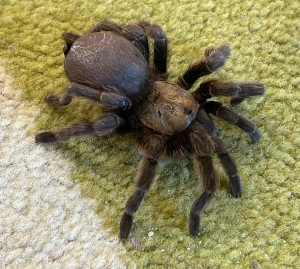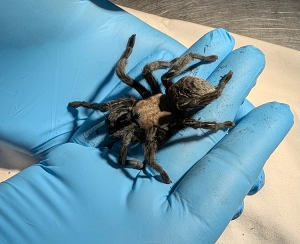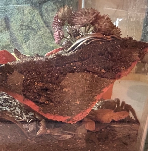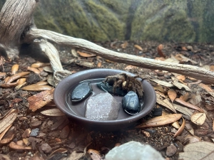 In January 2026, Ocho began showing signs that she was going into molt, a highly energy-intensive process that is stressful in even the best conditions. Molting in the wild leaves adult tarantulas highly vulnerable to dehydration, injury and death for the weeks leading up to and after the molt. As this was Ocho’s first molt since moving to the Center and out of an abundance of caution and respect, the education team decided to pull her off display to a darkened, quieter space. We ensured her habitat had all the necessary materials for her to be set up for success. Ocho completed her molt over the course of two days and looked amazing!